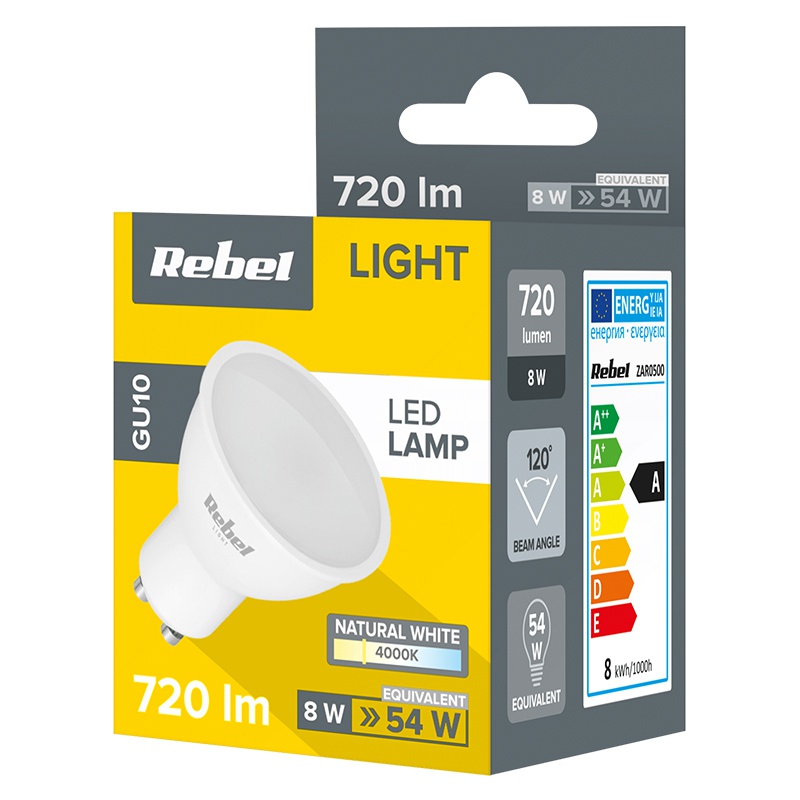 Bec Led GU10 8W 4000K 230V REBEL cu urmatoarele specificatii: